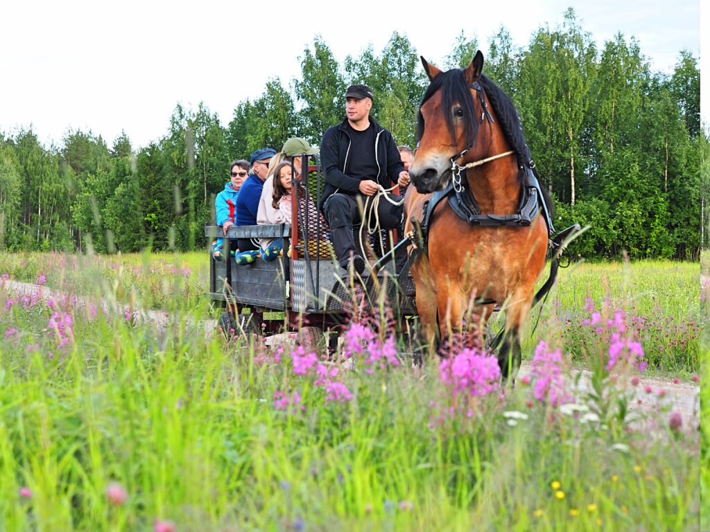 We start by preparing the horse for a ride with the carriage. The horse is of the breed north Swedish draft horse, an old Swedish country breed and we are happy to tell more about the breed’s origin and history for the curious. Then we go on a tour through the village, close by the Kalix river which offer magical views of the forrest and peacefullness. When we return to the farm, we end with “Swedish fika” (coffee/ tea/juice and snacks) in our outdoor barbeque hut or outdoor if the weathers is nice.